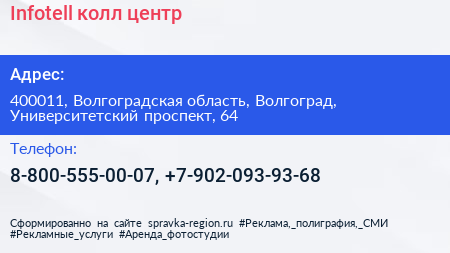 Infotell, колл-центр по адресу 400011, Волгоградская область, Волгоград, Университетский проспект, 64 в дальнейшем Организация, размещена в следующих категориях: