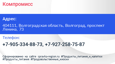 Компромисс по адресу 404111, Волгоградская область, Волгоград, проспект Ленина, 73 в дальнейшем Организация, размещена в следующих категориях: