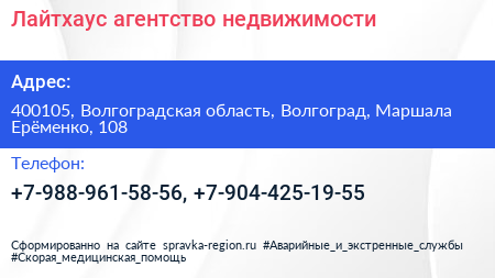 Лайтхаус, агентство недвижимости по адресу 400105, Волгоградская область, Волгоград, Маршала Ерёменко, 108 в дальнейшем Организация, размещена в следующих категориях: