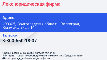 Лекс, юридическая фирма по адресу 400005, Волгоградская область, Волгоград, Коммунальная, 14 в дальнейшем Организация, размещена в следующих категориях: