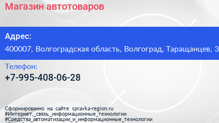 Магазин автотоваров по адресу 400007, Волгоградская область, Волгоград, Таращанцев, 3 в дальнейшем Организация, размещена в следующих категориях: