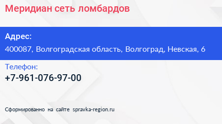 Меридиан, сеть ломбардов по адресу 400087, Волгоградская область, Волгоград, Невская, 6 в дальнейшем Организация, размещена в следующих категориях: