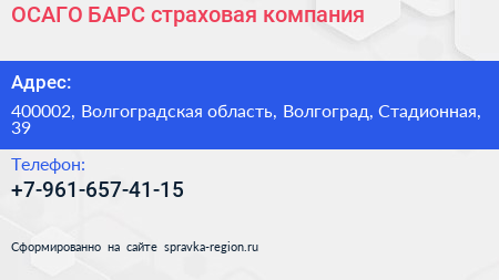 ОСАГО БАРС, страховая компания по адресу 400002, Волгоградская область, Волгоград, Стадионная, 39 в дальнейшем Организация, размещена в следующих категориях: