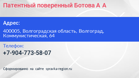 Патентный поверенный Ботова А.А. по адресу 400005, Волгоградская область, Волгоград, Коммунистическая, 64 в дальнейшем Организация, размещена в следующих категориях:
