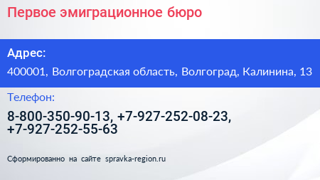 Первое эмиграционное бюро по адресу 400001, Волгоградская область, Волгоград, Калинина, 13 в дальнейшем Организация, размещена в следующих категориях: