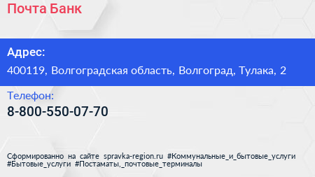 Почта Банк по адресу 400119, Волгоградская область, Волгоград, Тулака, 2 в дальнейшем Организация, размещена в следующих категориях: