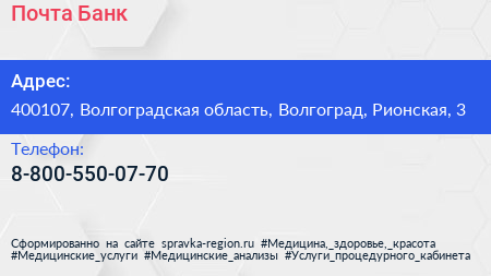 Почта Банк по адресу 400107, Волгоградская область, Волгоград, Рионская, 3 в дальнейшем Организация, размещена в следующих категориях: