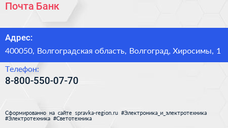 Почта Банк по адресу 400050, Волгоградская область, Волгоград, Хиросимы, 1 в дальнейшем Организация, размещена в следующих категориях: