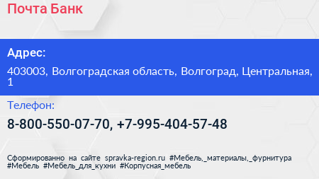 Почта Банк по адресу 403003, Волгоградская область, Волгоград, Центральная, 1 в дальнейшем Организация, размещена в следующих категориях: