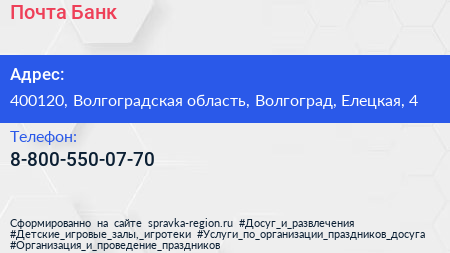 Почта Банк по адресу 400120, Волгоградская область, Волгоград, Елецкая, 4 в дальнейшем Организация, размещена в следующих категориях: