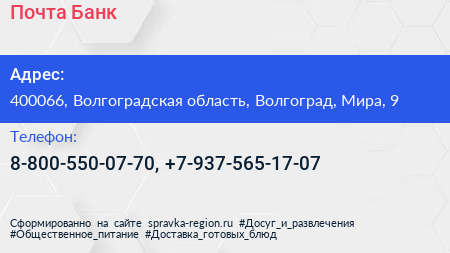 Почта Банк по адресу 400066, Волгоградская область, Волгоград, Мира, 9 в дальнейшем Организация, размещена в следующих категориях: