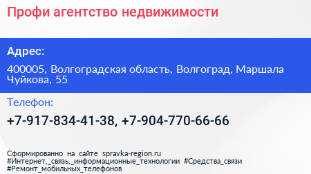 Профи, агентство недвижимости по адресу 400005, Волгоградская область, Волгоград, Маршала Чуйкова, 55 в дальнейшем Организация, размещена в следующих категориях: