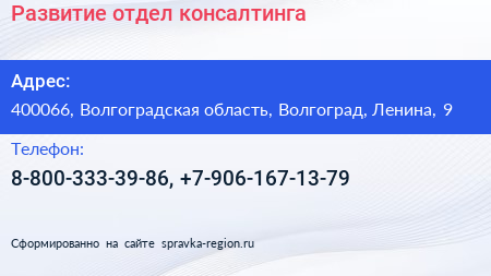 Развитие, отдел консалтинга по адресу 400066, Волгоградская область, Волгоград, Ленина, 9 в дальнейшем Организация, размещена в следующих категориях: