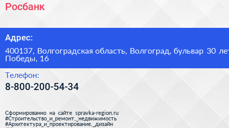 Росбанк по адресу 400137, Волгоградская область, Волгоград, бульвар 30 лет Победы, 16 в дальнейшем Организация, размещена в следующих категориях: