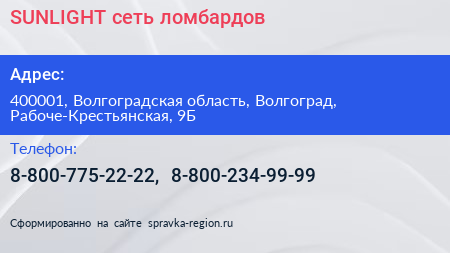 SUNLIGHT, сеть ломбардов по адресу 400001, Волгоградская область, Волгоград, Рабоче-Крестьянская, 9Б в дальнейшем Организация, размещена в следующих категориях: