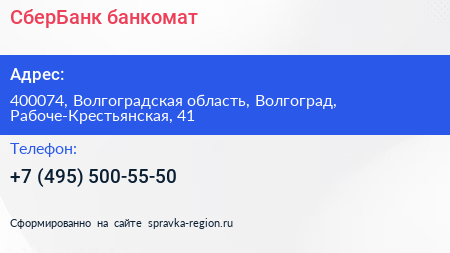 СберБанк, банкомат по адресу 400074, Волгоградская область, Волгоград, Рабоче-Крестьянская, 41 в дальнейшем Организация, размещена в следующих категориях:
