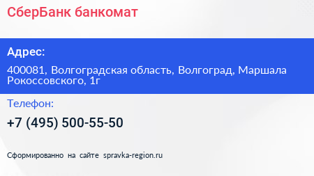 СберБанк, банкомат по адресу 400081, Волгоградская область, Волгоград, Маршала Рокоссовского, 1г в дальнейшем Организация, размещена в следующих категориях: