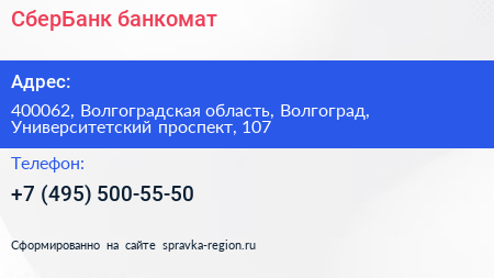 СберБанк, банкомат по адресу 400062, Волгоградская область, Волгоград, Университетский проспект, 107 в дальнейшем Организация, размещена в следующих категориях: