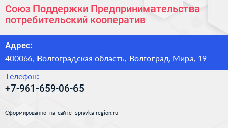 Союз Поддержки Предпринимательства, потребительский кооператив по адресу 400066, Волгоградская область, Волгоград, Мира, 19 в дальнейшем Организация, размещена в следующих категориях: