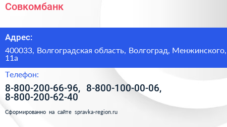 Совкомбанк по адресу 400033, Волгоградская область, Волгоград, Менжинского, 11а в дальнейшем Организация, размещена в следующих категориях: