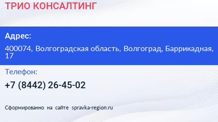 ТРИО-КОНСАЛТИНГ по адресу 400074, Волгоградская область, Волгоград, Баррикадная, 17 в дальнейшем Организация, размещена в следующих категориях: