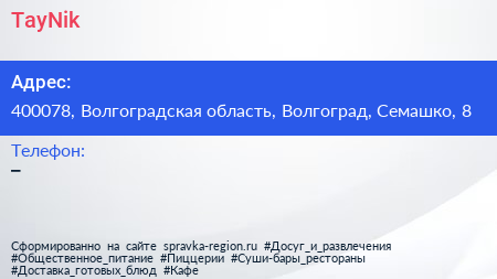 TayNik по адресу 400078, Волгоградская область, Волгоград, Семашко, 8 в дальнейшем Организация, размещена в следующих категориях: