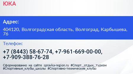 ЮКА по адресу 404120, Волгоградская область, Волгоград, Карбышева, 76 в дальнейшем Организация, размещена в следующих категориях: