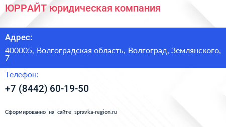 ЮРРАЙТ, юридическая компания по адресу 400005, Волгоградская область, Волгоград, Землянского, 7 в дальнейшем Организация, размещена в следующих категориях: