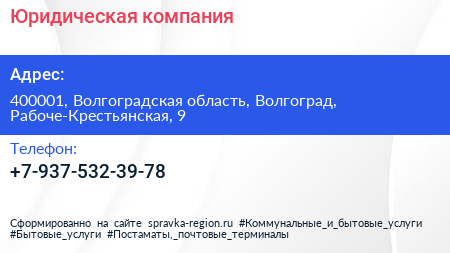 Юридическая компания по адресу 400001, Волгоградская область, Волгоград, Рабоче-Крестьянская, 9 в дальнейшем Организация, размещена в следующих категориях: