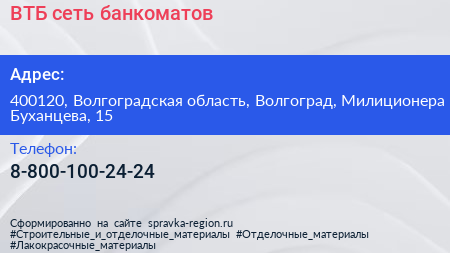 ВТБ, сеть банкоматов по адресу 400120, Волгоградская область, Волгоград, Милиционера Буханцева, 15 в дальнейшем Организация, размещена в следующих категориях: