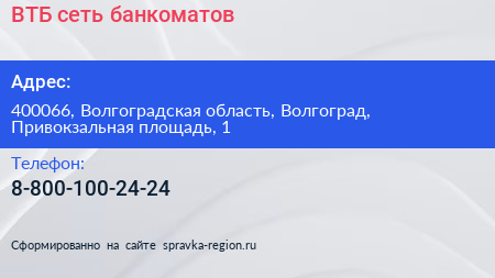 ВТБ, сеть банкоматов по адресу 400066, Волгоградская область, Волгоград, Привокзальная площадь, 1 в дальнейшем Организация, размещена в следующих категориях: