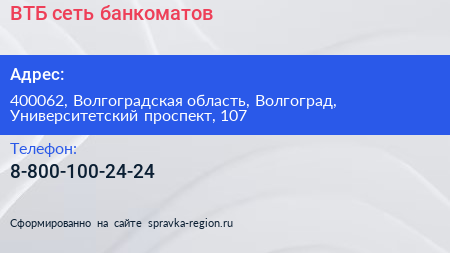 ВТБ, сеть банкоматов по адресу 400062, Волгоградская область, Волгоград, Университетский проспект, 107 в дальнейшем Организация, размещена в следующих категориях: