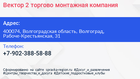 Вектор-2, торгово-монтажная компания по адресу 400074, Волгоградская область, Волгоград, Рабоче-Крестьянская, 31 в дальнейшем Организация, размещена в следующих категориях: