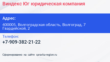 Виндекс-Юг, юридическая компания по адресу 400005, Волгоградская область, Волгоград, 7 Гвардейской, 2 в дальнейшем Организация, размещена в следующих категориях:
