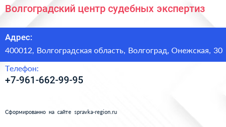 Волгоградский центр судебных экспертиз по адресу 400012, Волгоградская область, Волгоград, Онежская, 30 в дальнейшем Организация, размещена в следующих категориях: