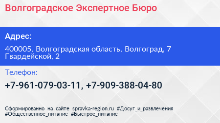 Волгоградское Экспертное Бюро по адресу 400005, Волгоградская область, Волгоград, 7 Гвардейской, 2 в дальнейшем Организация, размещена в следующих категориях: