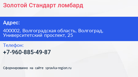 Золотой Стандарт, ломбард по адресу 400002, Волгоградская область, Волгоград, Университетский проспект, 25 в дальнейшем Организация, размещена в следующих категориях: