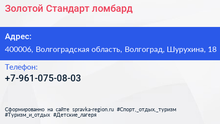 Золотой Стандарт, ломбард по адресу 400006, Волгоградская область, Волгоград, Шурухина, 18 в дальнейшем Организация, размещена в следующих категориях: