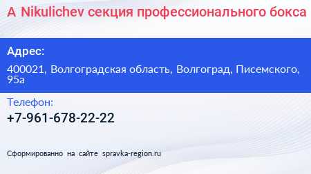 A.Nikulichev, секция профессионального бокса по адресу 400021, Волгоградская область, Волгоград, Писемского, 95а в дальнейшем Организация, размещена в следующих категориях: