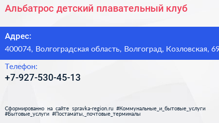 Альбатрос, детский плавательный клуб по адресу 400074, Волгоградская область, Волгоград, Козловская, 69 в дальнейшем Организация, размещена в следующих категориях: