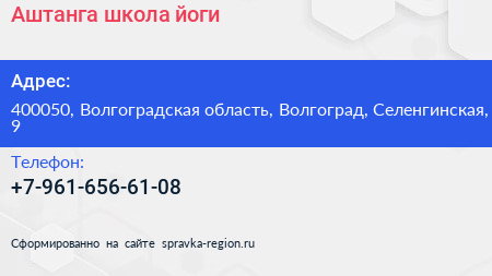 Аштанга, школа йоги по адресу 400050, Волгоградская область, Волгоград, Селенгинская, 9 в дальнейшем Организация, размещена в следующих категориях: