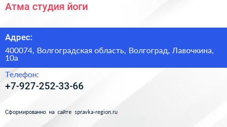 Атма, студия йоги по адресу 400074, Волгоградская область, Волгоград, Лавочкина, 10а в дальнейшем Организация, размещена в следующих категориях: