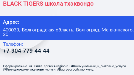 BLACK TIGERS, школа тхэквондо по адресу 400033, Волгоградская область, Волгоград, Менжинского, 20 в дальнейшем Организация, размещена в следующих категориях: