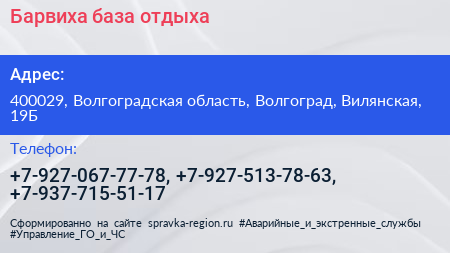 Барвиха, база отдыха по адресу 400029, Волгоградская область, Волгоград, Вилянская, 19Б в дальнейшем Организация, размещена в следующих категориях: