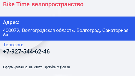 Bike Time, велопространство по адресу 400079, Волгоградская область, Волгоград, Санаторная, 6а в дальнейшем Организация, размещена в следующих категориях: