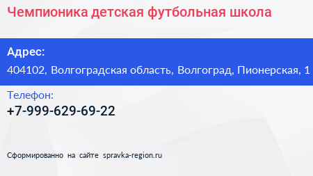 Чемпионика, детская футбольная школа по адресу 404102, Волгоградская область, Волгоград, Пионерская, 1 в дальнейшем Организация, размещена в следующих категориях: