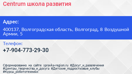 Centrum, школа развития по адресу 400137, Волгоградская область, Волгоград, 8 Воздушной Армии, 5 в дальнейшем Организация, размещена в следующих категориях: