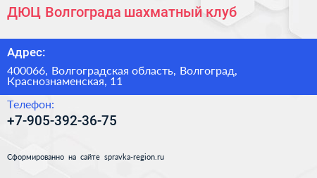 ДЮЦ Волгограда, шахматный клуб по адресу 400066, Волгоградская область, Волгоград, Краснознаменская, 11 в дальнейшем Организация, размещена в следующих категориях: