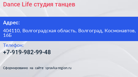 Dance Life, студия танцев по адресу 404110, Волгоградская область, Волгоград, Космонавтов, 16Б в дальнейшем Организация, размещена в следующих категориях: