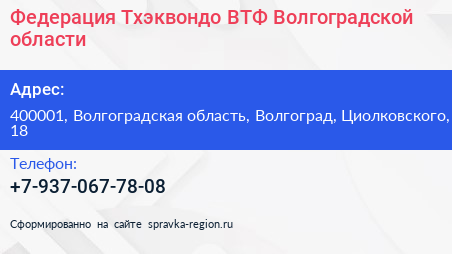 Федерация Тхэквондо ВТФ Волгоградской области по адресу 400001, Волгоградская область, Волгоград, Циолковского, 18 в дальнейшем Организация, размещена в следующих категориях:
